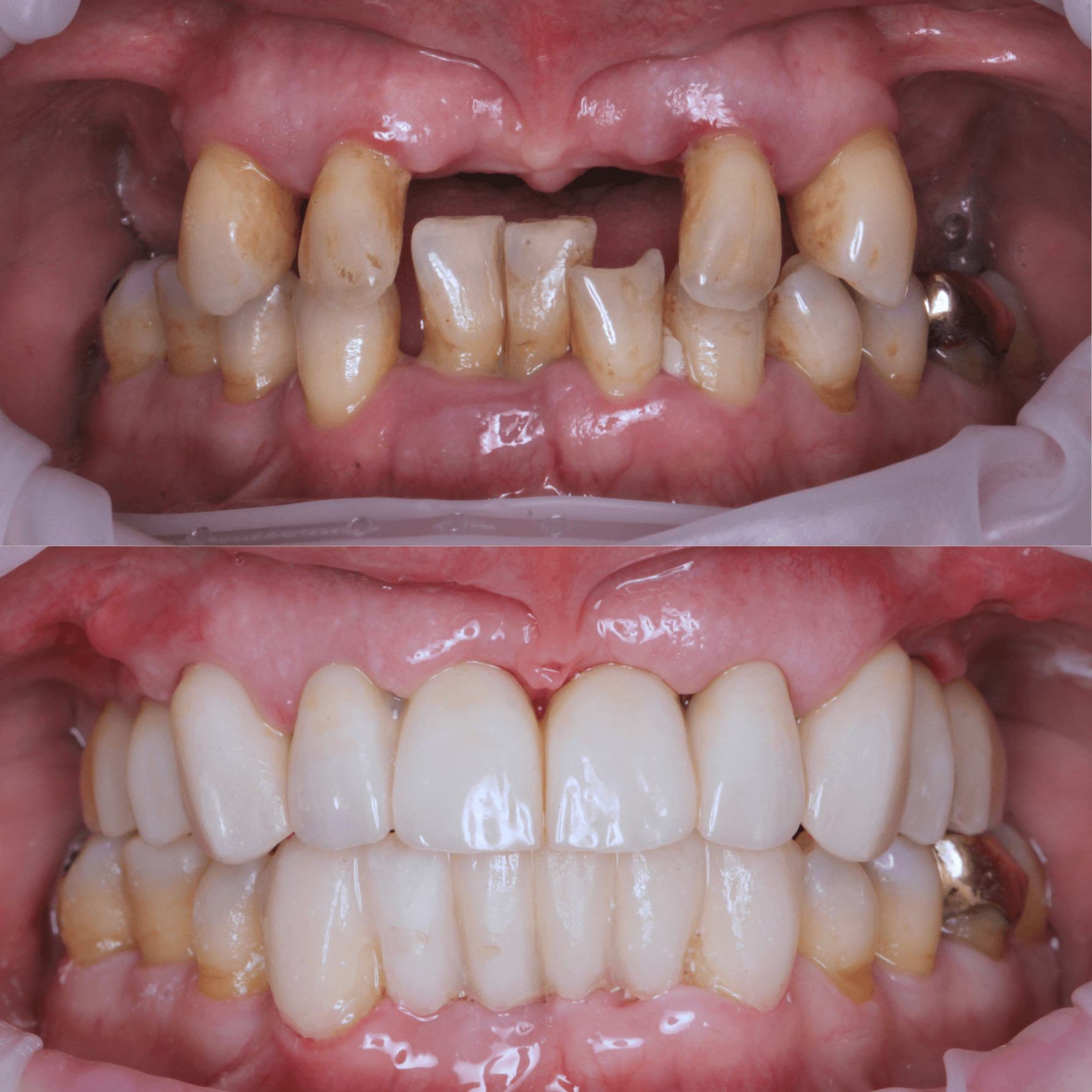Restoration through dental implants and enhanced shaping with composite bonding, resulting in a complete smile.