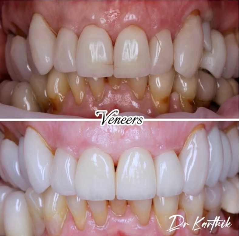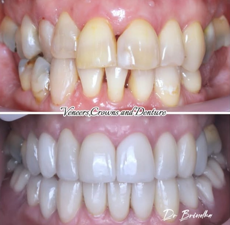 Whitening, reshaping, and restoring worn and broken teeth, resulting in a brighter, more even, and natural-looking smile.